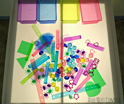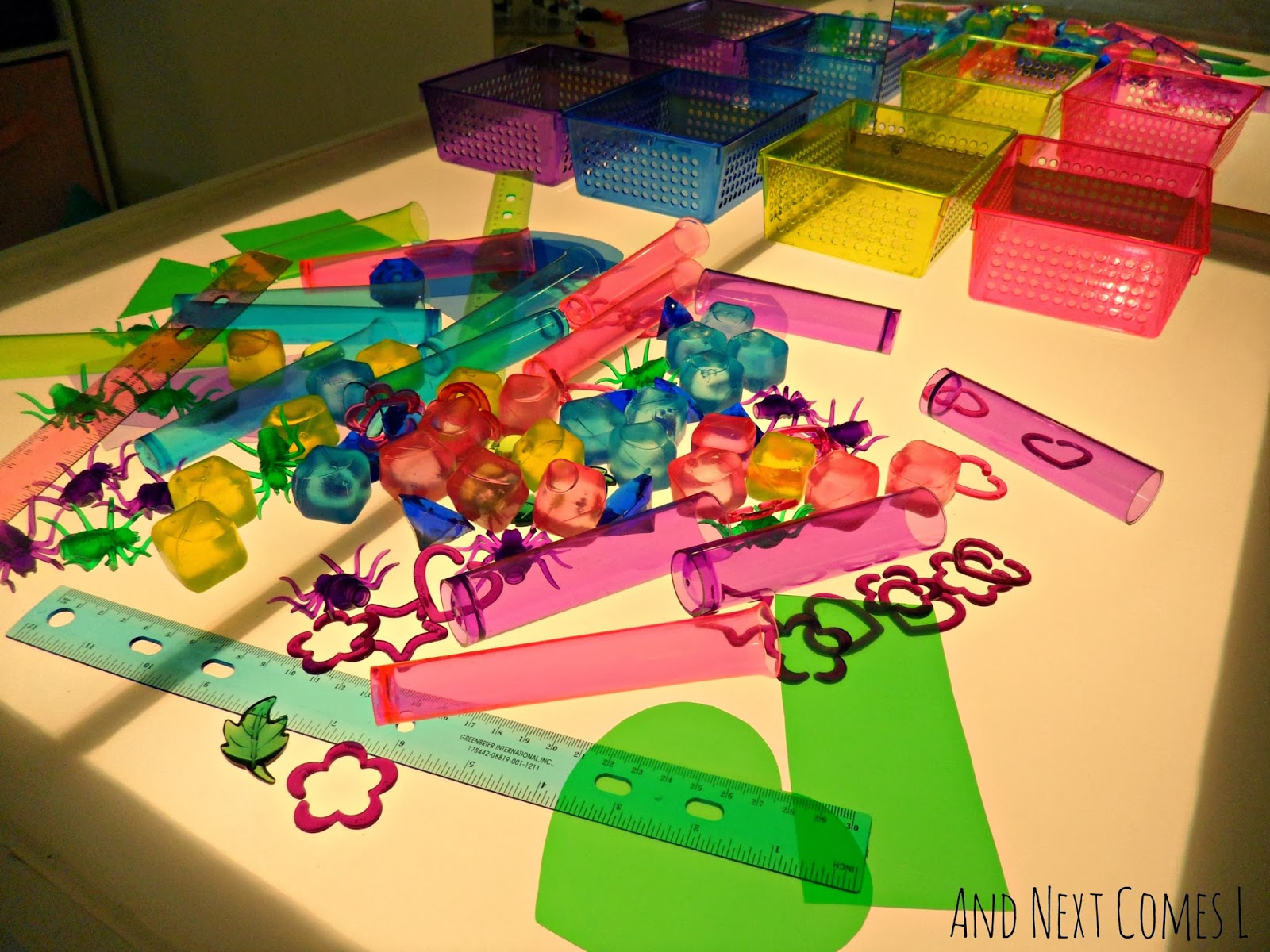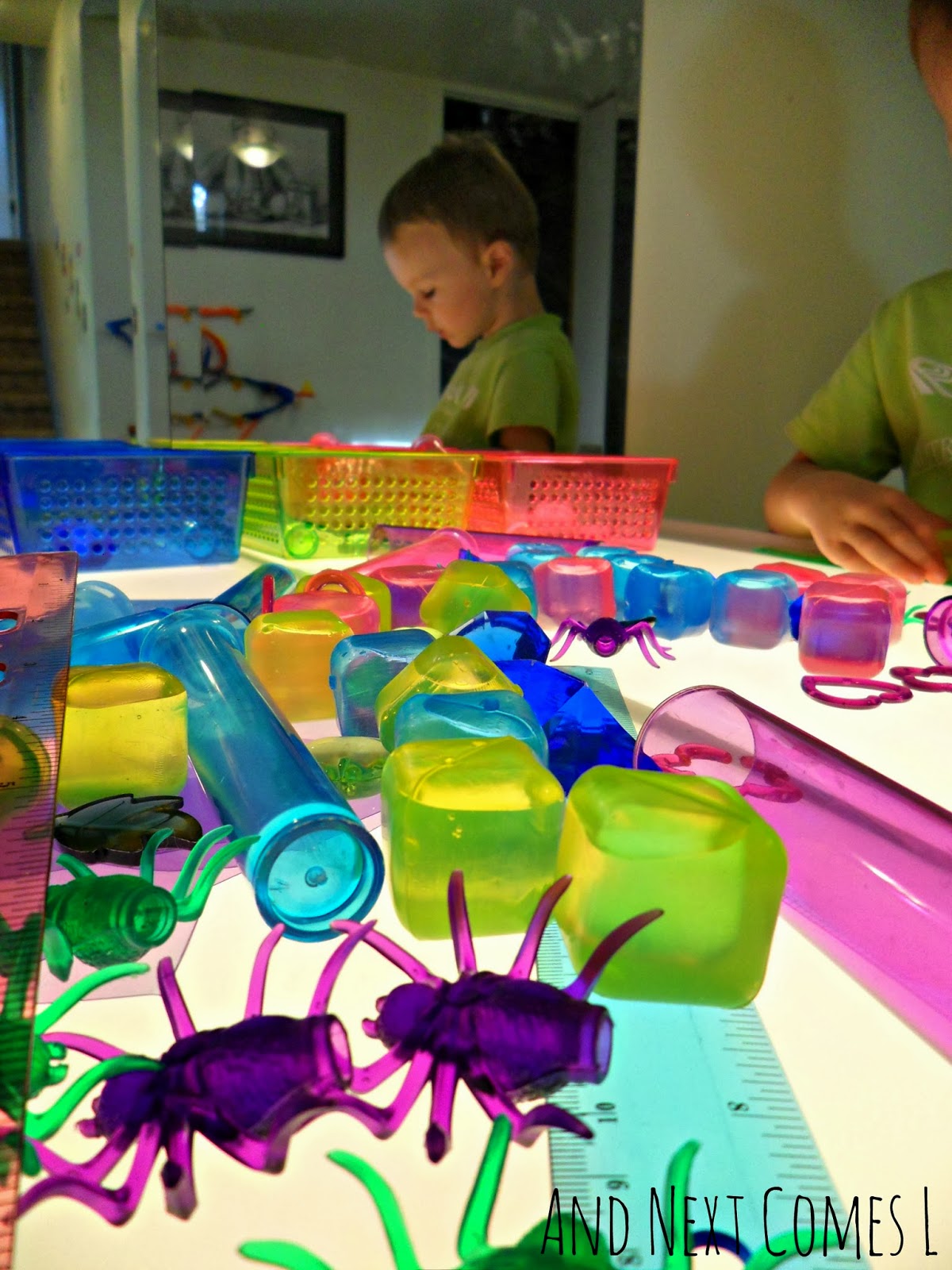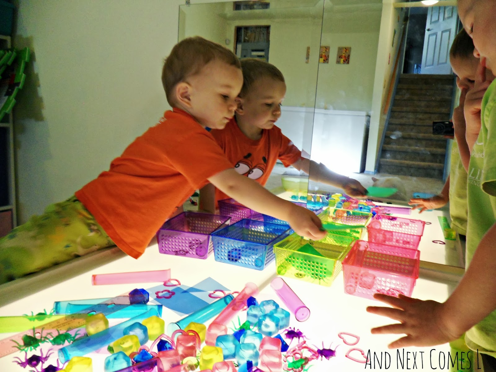 You may notice that we recently hung some inexpensive mirrors above our light table. I love the added element of reflection to our light table play.
