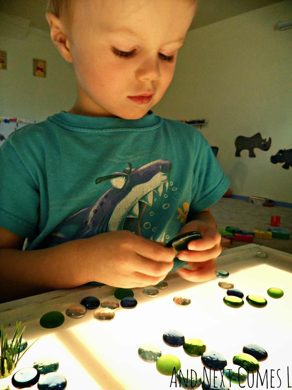 Then J spent quite a bit of time carefully examining the different glass stones, especially the lily pad stones.