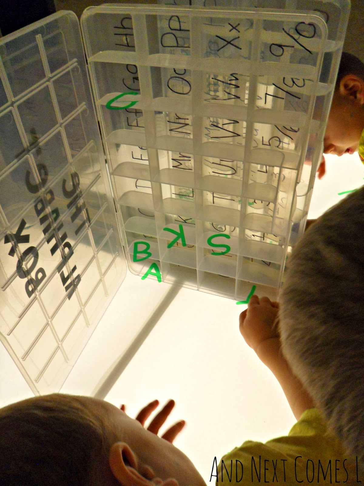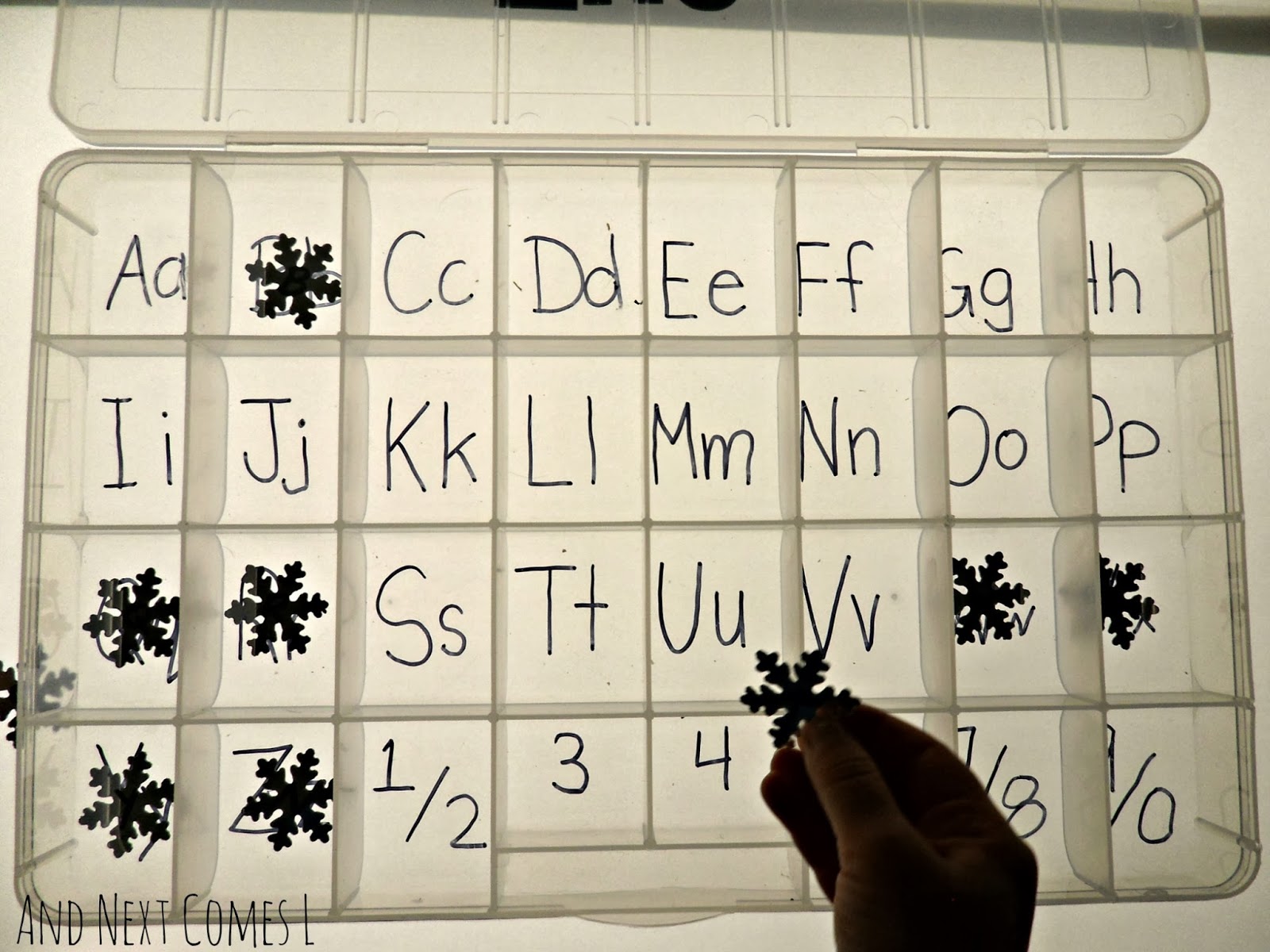 If you haven't made our alphabet busy box yet, then you'll need a plastic storage container like this 32 compartment no spill bead organizer. Then you'll need some kind of alphabet manipulatives such as our mirrored alphabet snowflakes, transparent letters, or homemade alphabet beads.