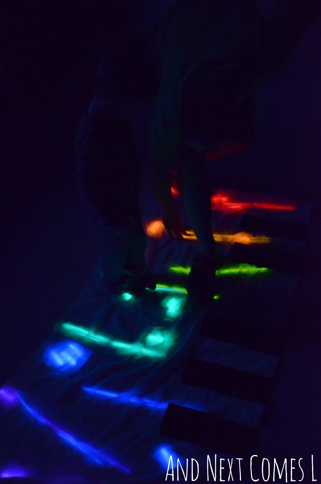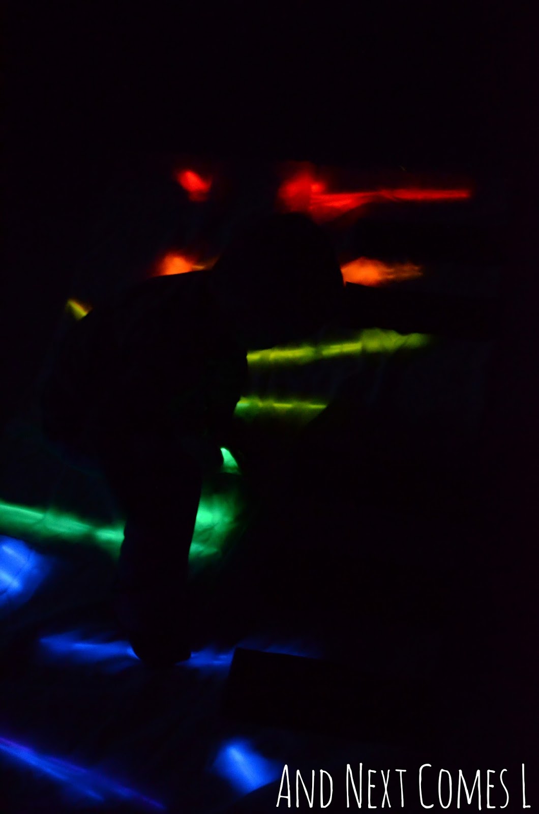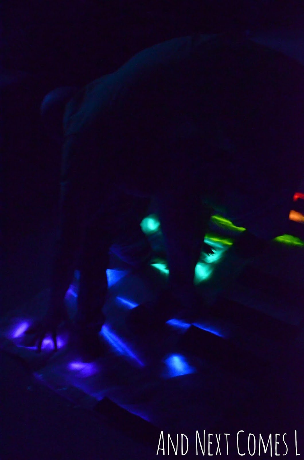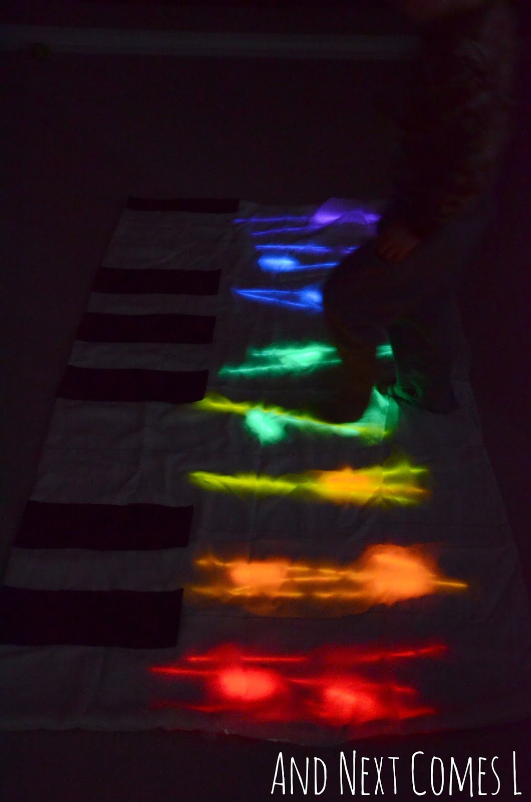It's time for Light & Reflections again! This month's theme is music and movement and well, music is kind of my specialty. We have done many music themed activities using light in the past, including music matching on the light table, music play on the overhead projector, and rainbow drums on the light table. However, I wanted to switch things up and move away from the light table for this month's post. Instead, I created a giant homemade glow-in-the-dark floor piano using glow sticks. Lots and lots of glow sticks!