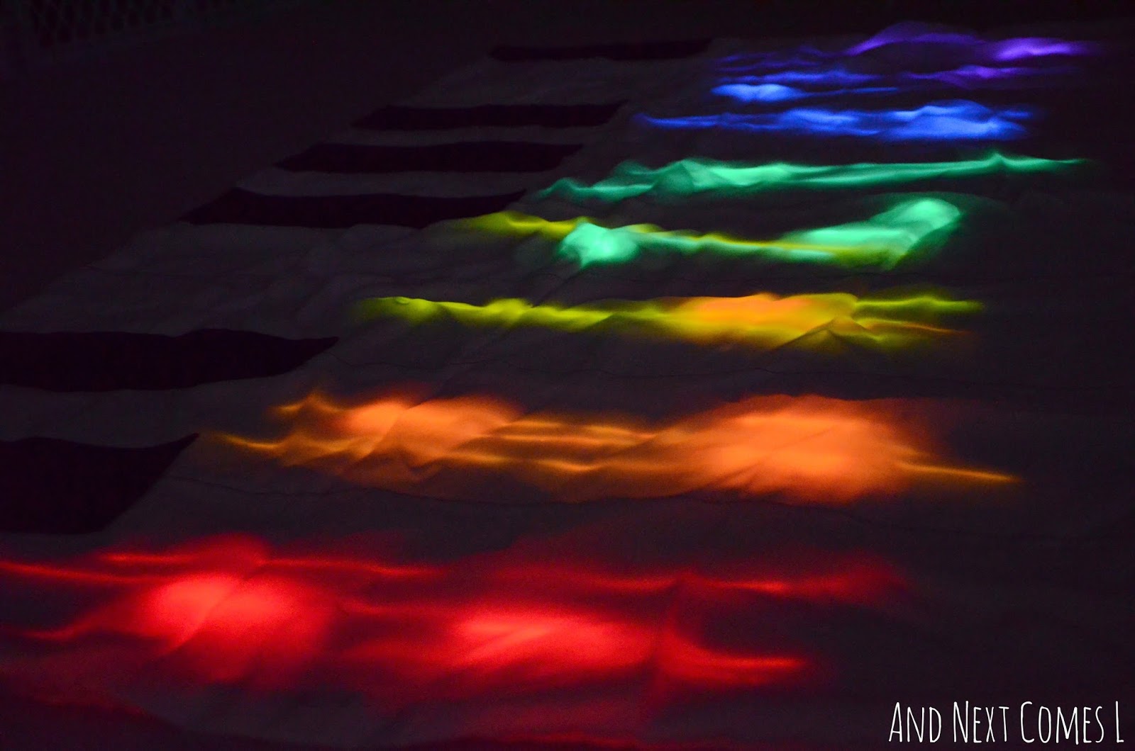 I decided to turn our glowing floor piano into a rainbow, as you can see. I also taped the piano to the floor so that it wouldn't roll or bunch up during play.