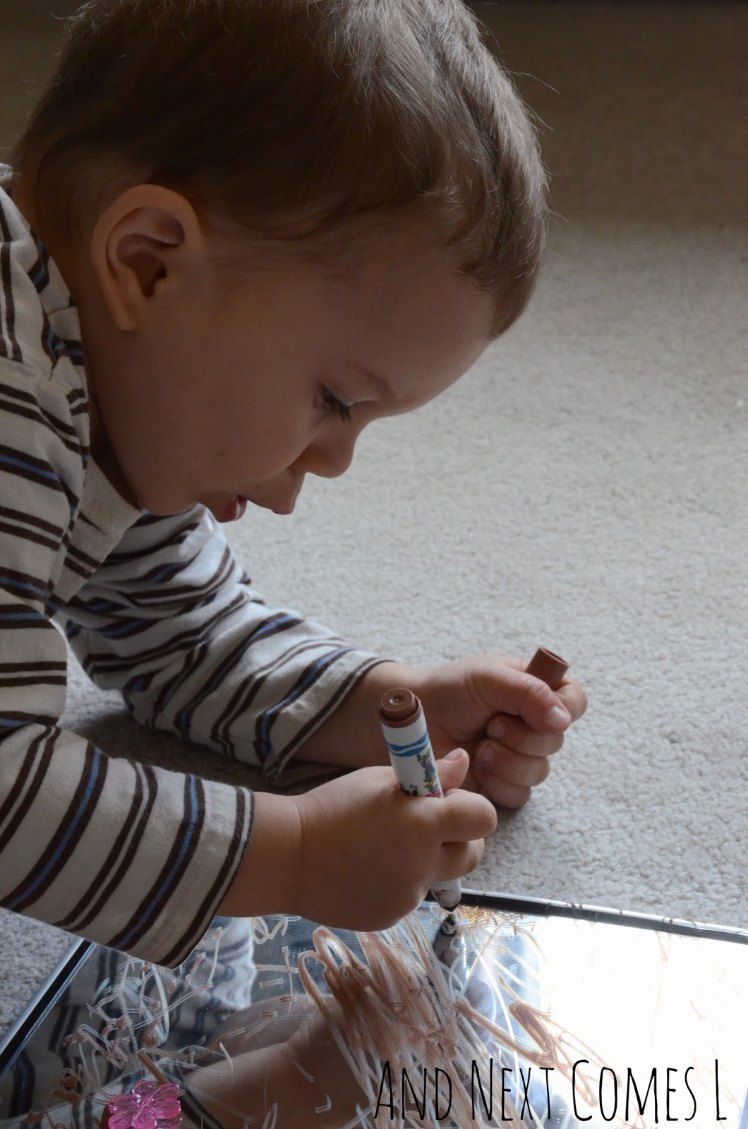 I've never seen him so interested in drawing and coloring before. It was so cute to watch him lean in so close while he colored. He was so focused on what he wanted to draw and quite purposeful with his mark making. He definitely had a plan in mind for his mirror drawing and was determined to make it come to life.