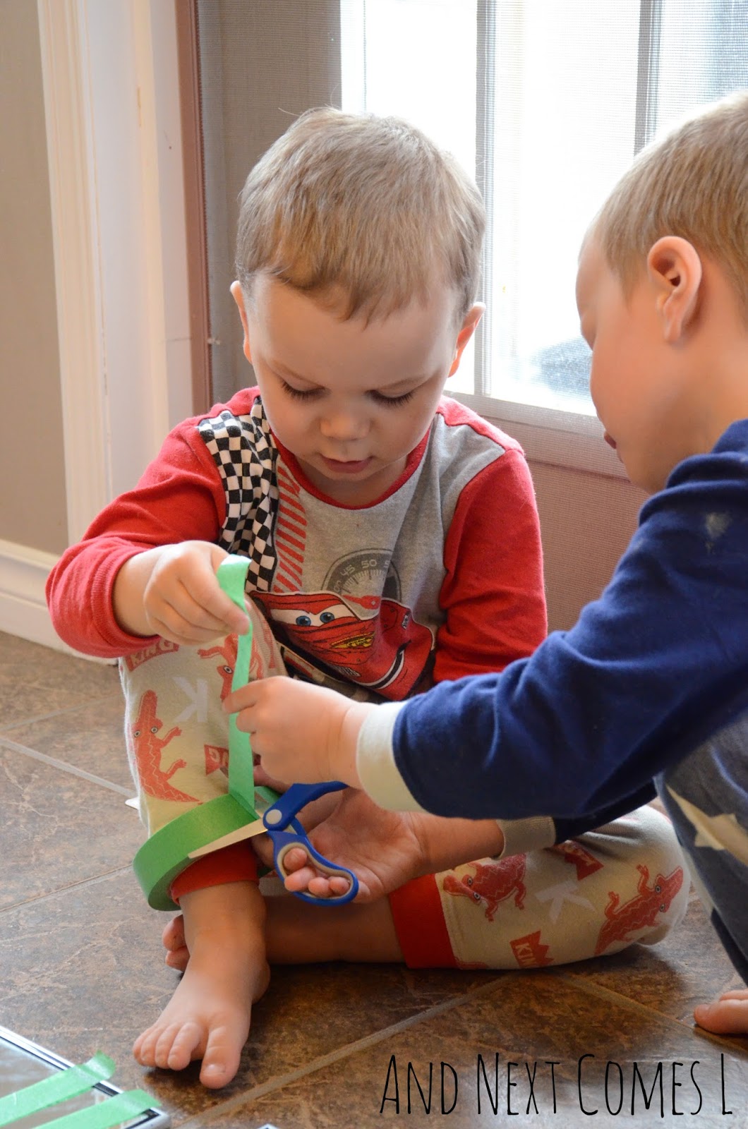 First, the boys cut strips of tape and placed them on their mirrors. The boys worked together to cut the tape, which was really cute. Especially since K would slide the roll of tape around his feet or ankle to hold it in place.