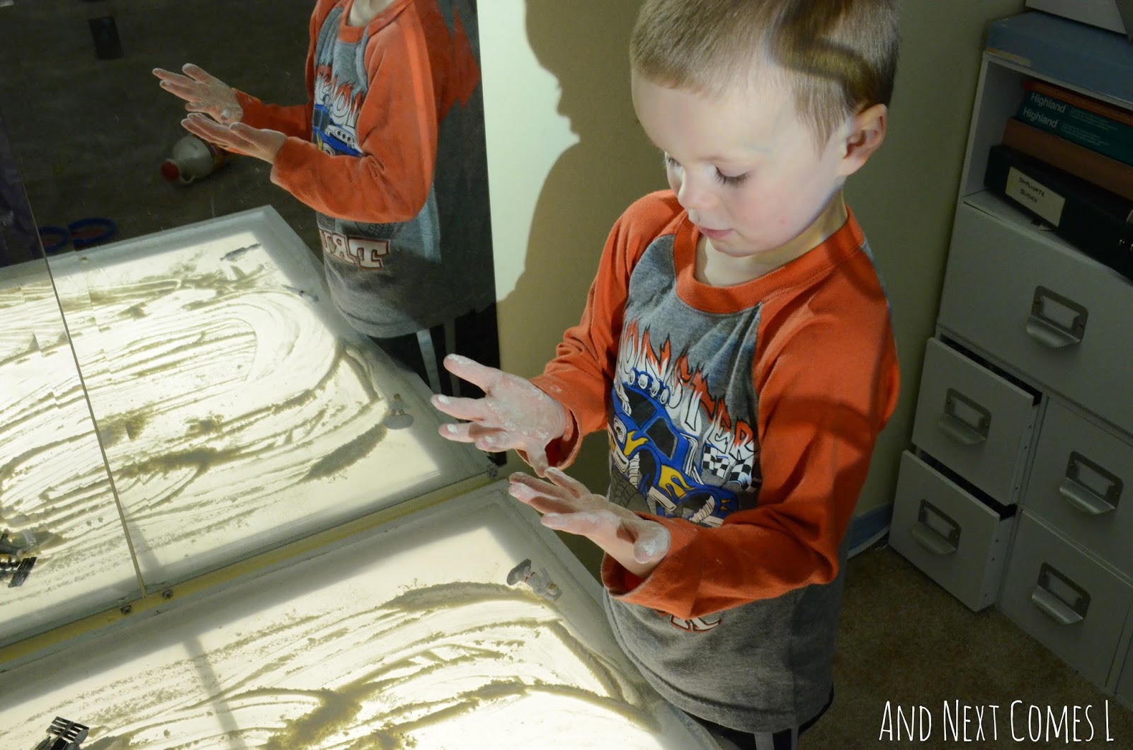 - Instead of putting the flour directly on the light table, put it into a clear plastic container instead. Then place that on top of the light table. You're basically creating a small world in a sensory bin or on a play tray.