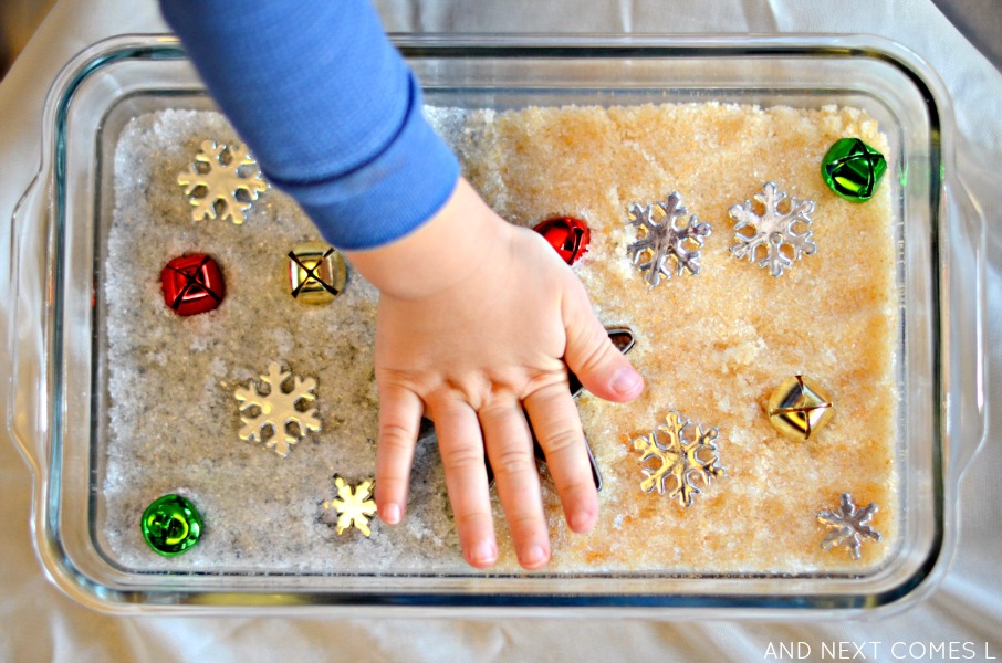 Looking for Christmas sensory activities for toddlers or preschoolers? Then you'll want to try this Christmas sensory bin with dyed epsom salt.